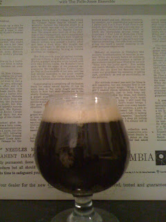 Captain Lawrence Nor'Easter Winter Warmer (Strong Ale)-Community Beverage, Queens, NY- 25.6 oz. bomber into 12OZ. Brandy Snifter- 12% ABV- Poured very dark brown with some hints of ruby when held up to the light. About a fingers worth of dense, dark tan head. Little to no lacing and the head receded at a medium pace. Off the bat this ale had a strong alcohol aroma. You could say overpowering but that is not to say its bad. This is advertised as a winter warmer so I was actually hoping it would be on the "boozy" side. After it warmed up a bit I did detect some dark "berry" like qualities which could be attributed to the elderberries used in the brewing process and maybe some woodieness as well. This is not a beer for the faint of heart. This is a kick back and take it easy kind of beer with a couple of good records and not much else to do. Definitely alot of bourbon qualities found here and I like it. This beer was an expensive and I kind of had buyers remorse after purchasing it. I have wanted to try a bourbon barrel aged beer for awhile and this is the first one I came across and it ended up being more expensive than I anticipated. I probably would not get this beer again but I am glad I tried it and it fit the bill for a "winter warmer".